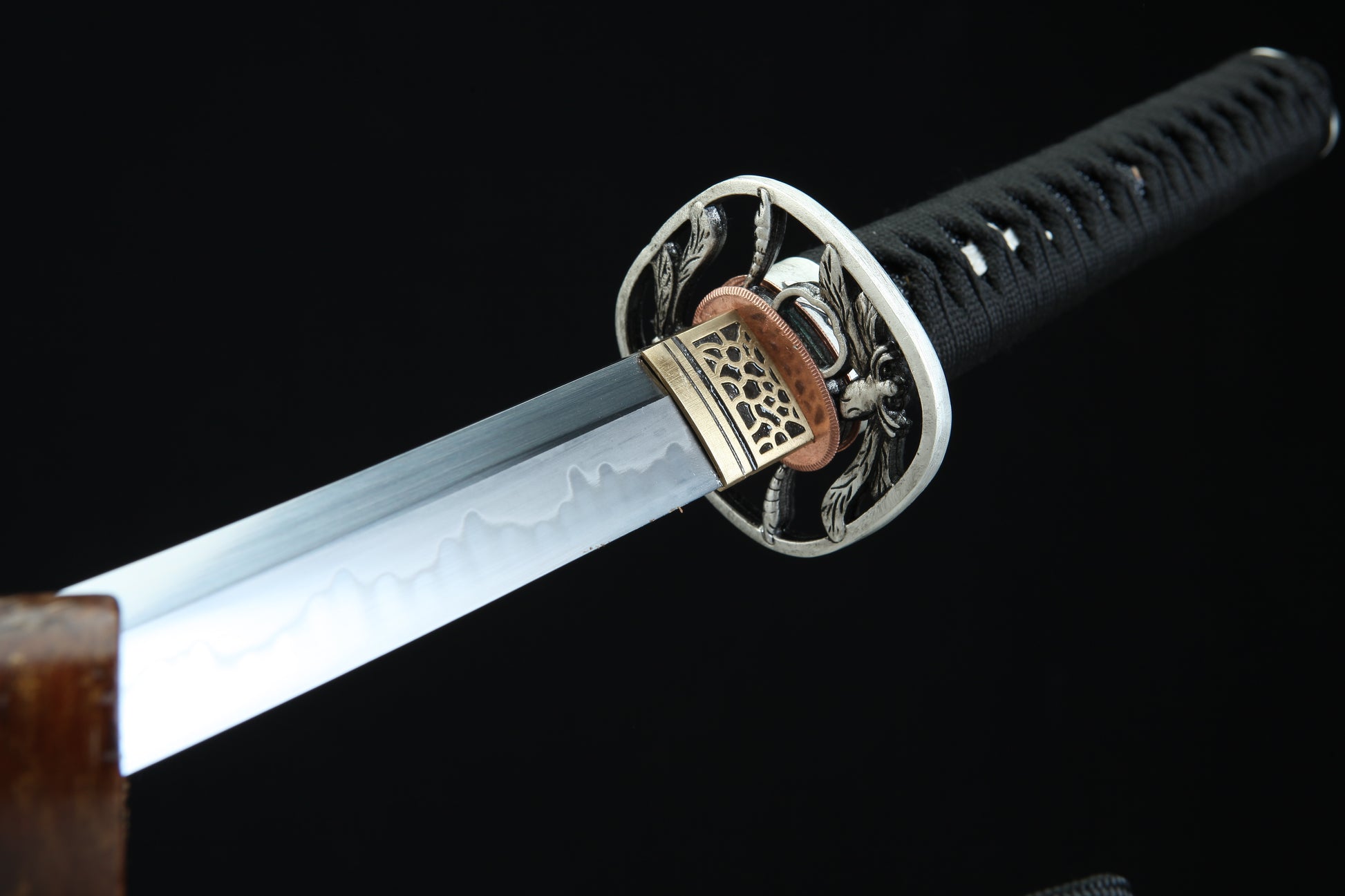 This masterfully crafted katana features a clay-tempered T8 carbon steel blade, designed to deliver both cutting power and resilience. The silver-plated fittings and lacquered wood scabbard highlight elegant detailing, while the handle—crafted from wood and wrapped in real fish skin (samegawa)—provides authenticity and a traditional grip.