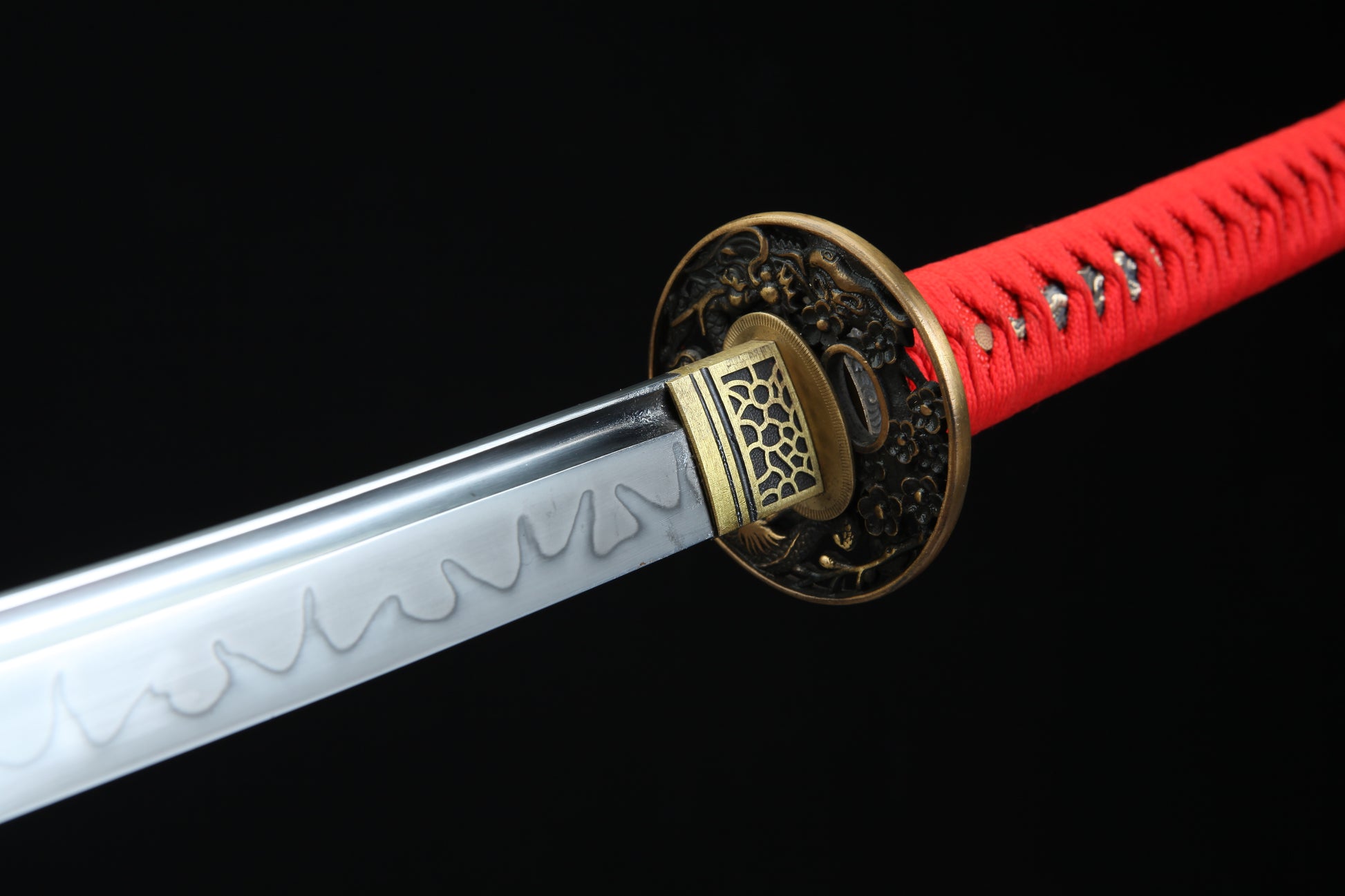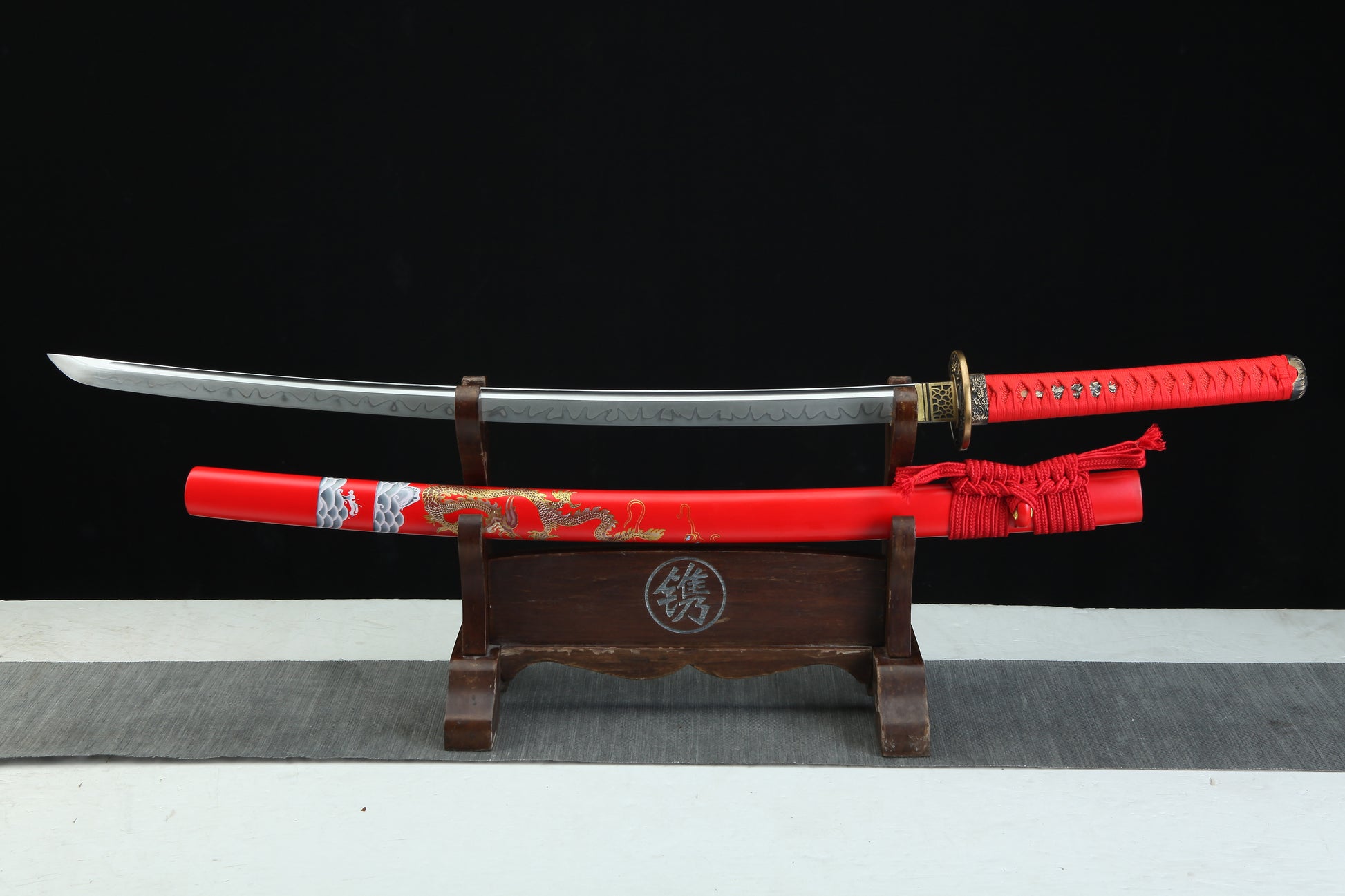 Collectors will appreciate the detailed bronze menuki embellishments on the handle that add historical authenticity without compromising comfort. The vibrant red saya katana not only protects the blade but also serves as an eye-catching focal point in any display.