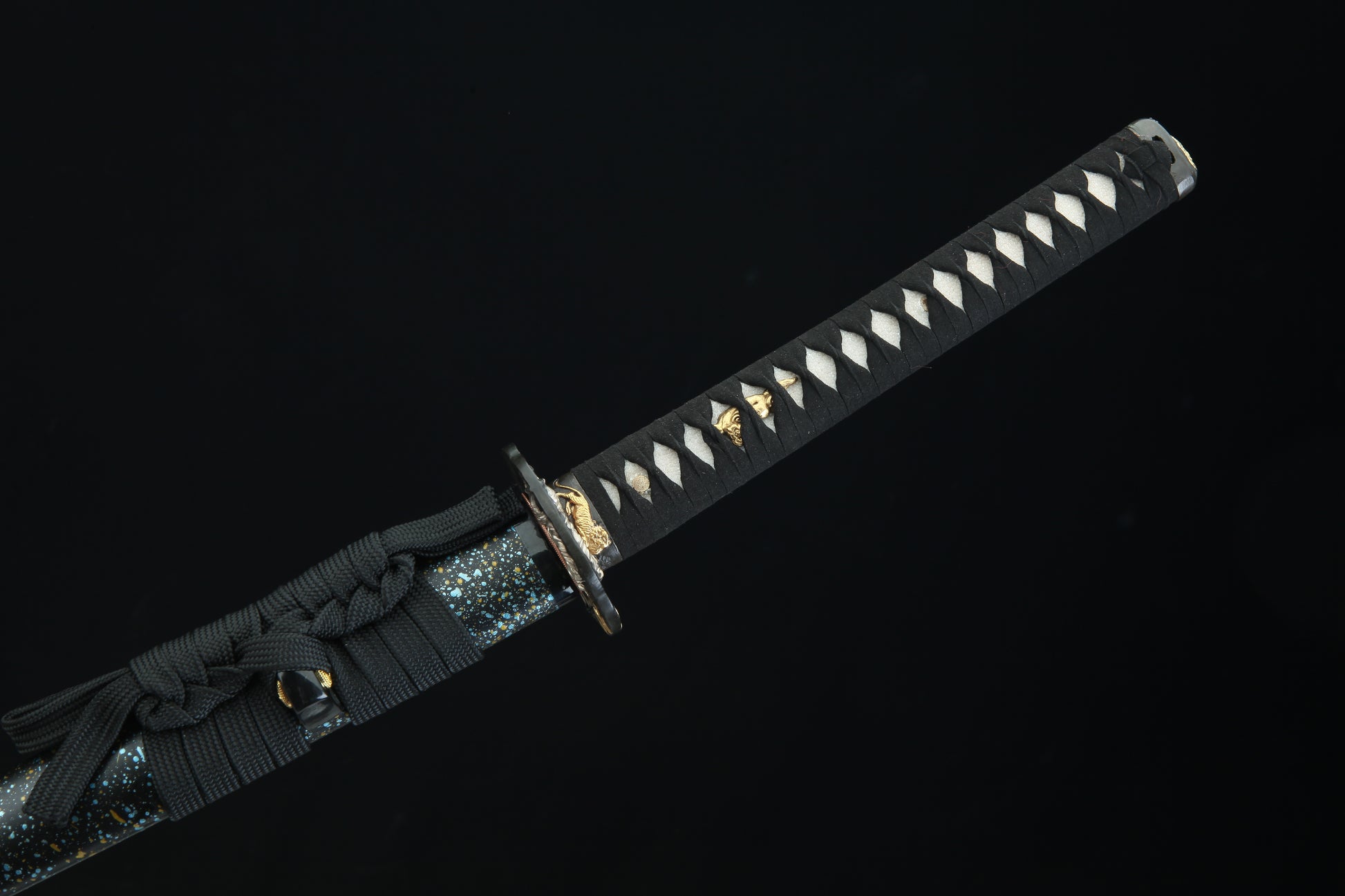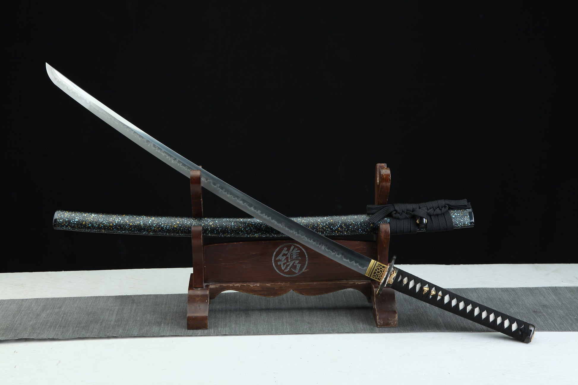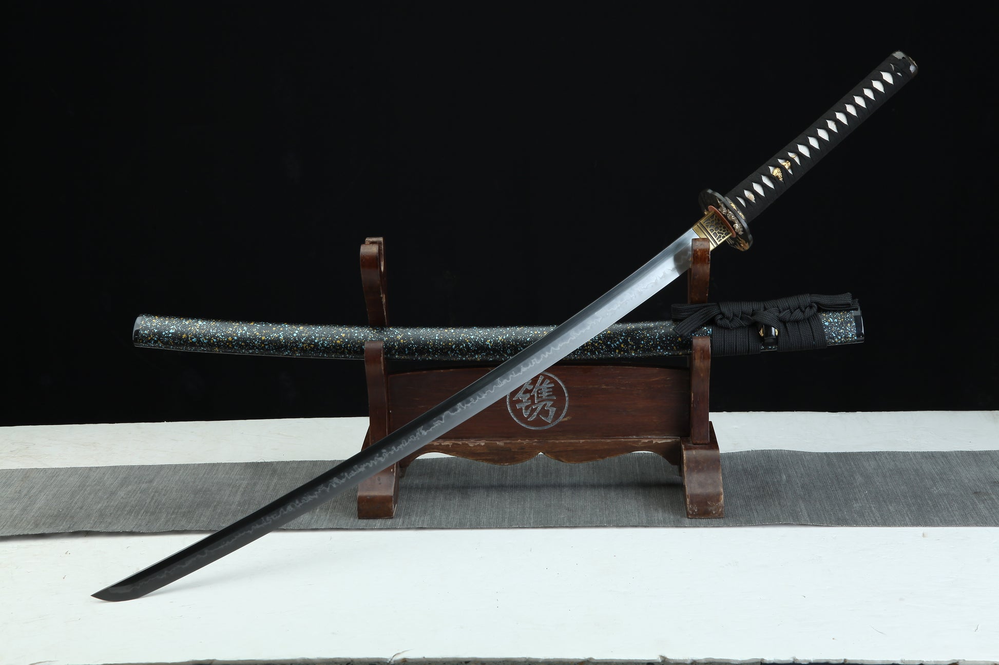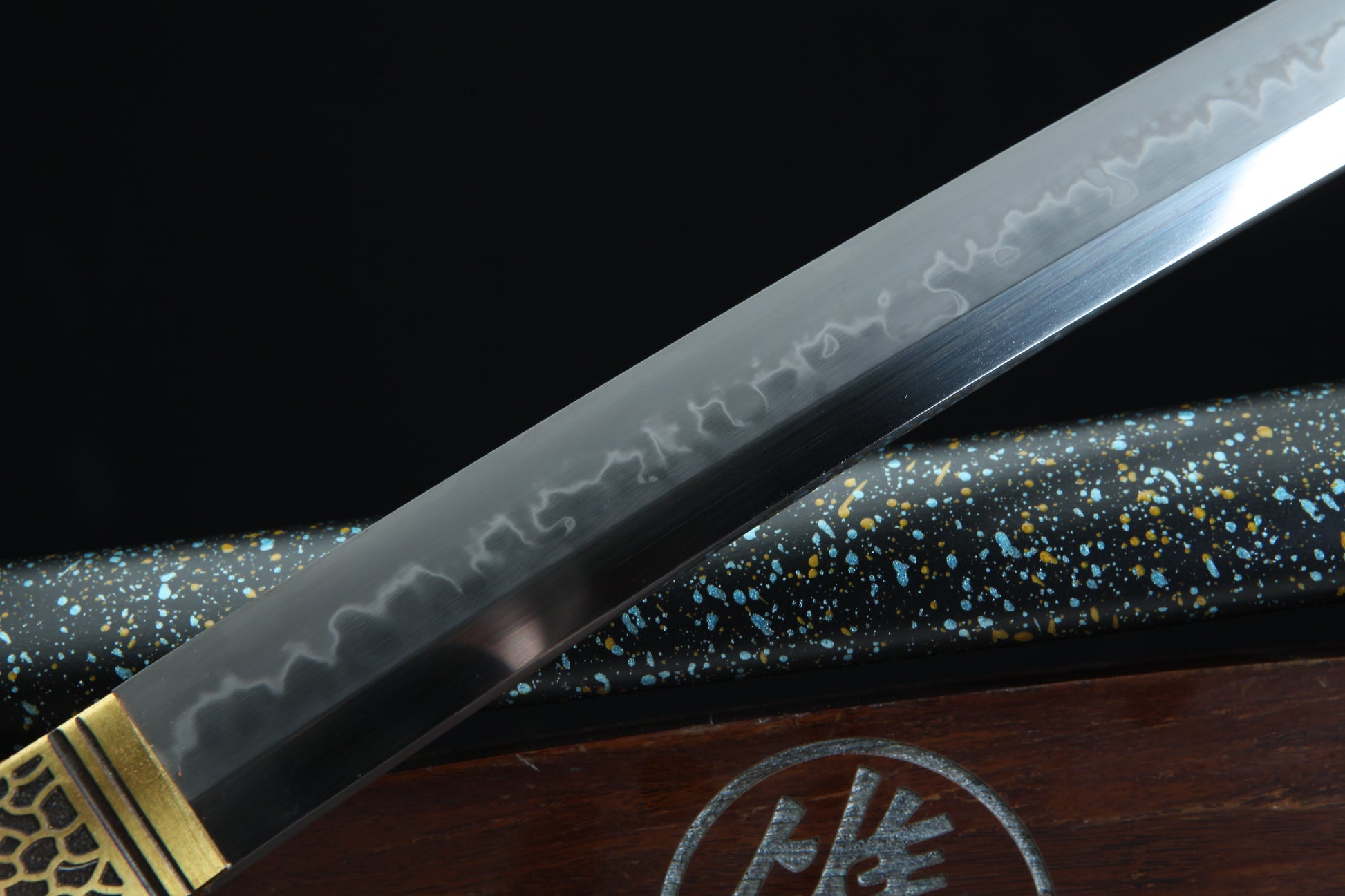 The Koshō 虎嘯 (Tiger’s Roar) katana embodies the fierce spirit of the samurai. Forged from clay-tempered 1095 carbon steel, it features a striking hamon temper line, gold and silver plated bronze fittings, and a handle wrapped in authentic fish skin. The solid wood saya reinforced with cow horn completes this masterwork of Japanese craftsmanship. Perfect for collectors, martial artists, and ceremonial display.