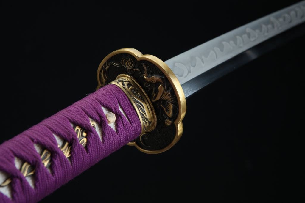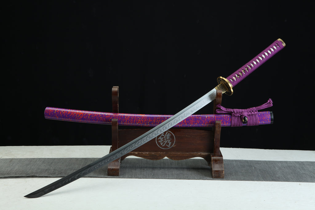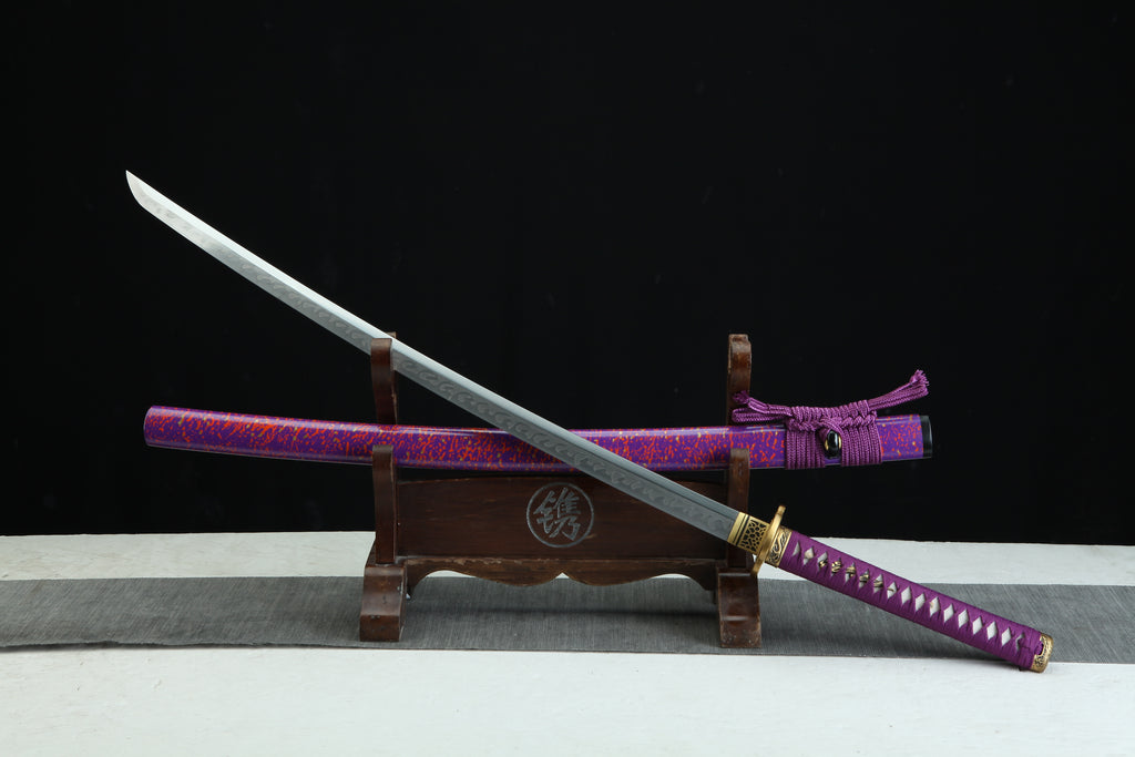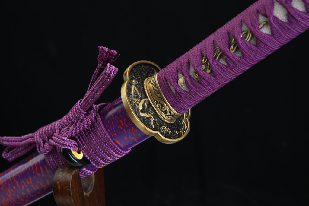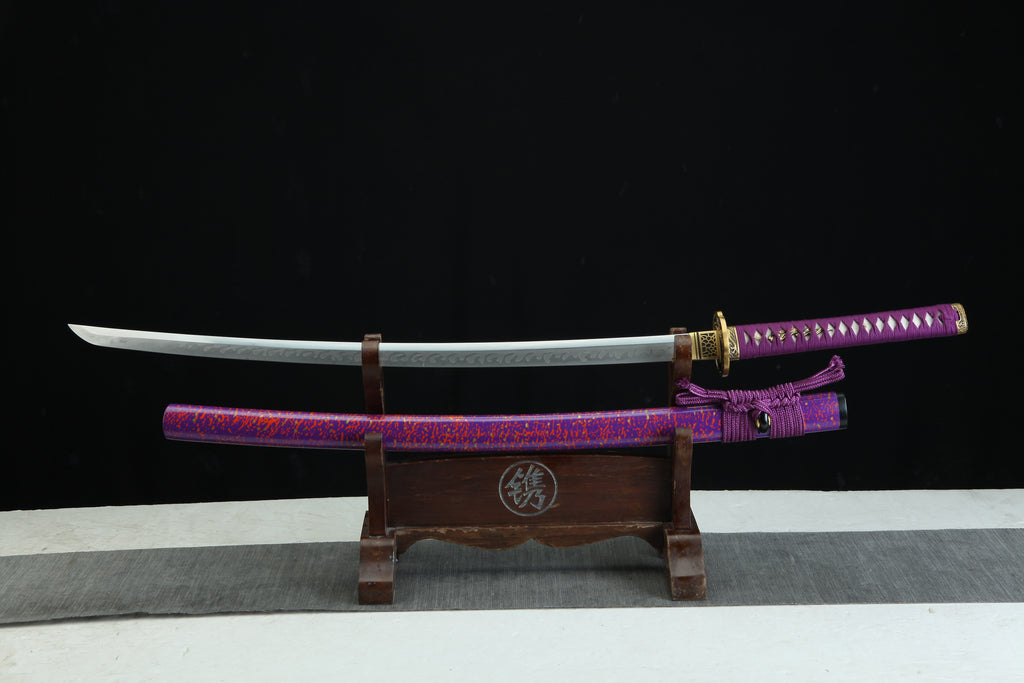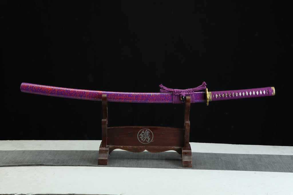 The Kyūbi 九尾 T10— MoonSwords Katana (Purple) is a samurai collectible sword designed for enthusiasts seeking an authentic samurai blade that combines traditional craftsmanship with striking aesthetics. Crafted with a hand forged katana method, this high carbon steel katana features a clay-tempered T10 steel blade that delivers durability and sharpness, making it both a decorative sword display and a battle ready katana. Its purple colorway and ornate sword handle create a unique presence that stands out in any collection.