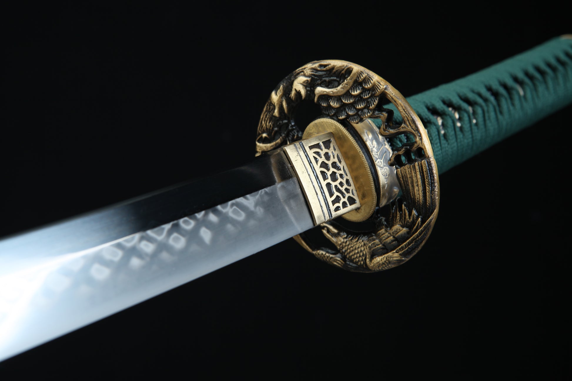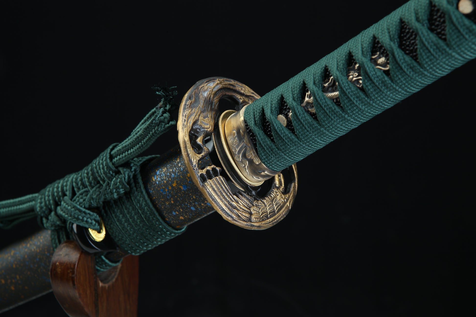 - Premium Tsuka (Handle): Genuine fish skin (same) wrapped in green silk cord (ito) for authentic grip